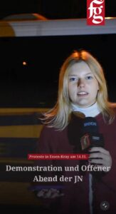 egenentwurf zur angeblich „gleichgeschalteten“ Unikultur inszeniert. Weil die Studierenden keinen Bock auf Neonazis haben und dies auch öffentlich kundtun, verkriecht sich der zum Scheitern verurteilte Lehramtsstudent in die Opferrolle und Flucht gegen den bunten und weltoffenen Campus. Der bisher letzte Beitrag des Projekts ist ein Kurzvideo über den offenen Abend in Essen am 14.11.2025. Zu sehen: Steinicke, sichtbar nervös, vor einer wackeligen Kamera. Sie erklärt, dass die Heimatjugend „trotz Gegenprotest“ wieder „Widerstand gezeigt“ habe. Der Auftritt ist unsicher, die Sätze brechen, der Blick wandert, die Körpersprache schwankt zwischen Stolz und Überforderung. Professionell ist das nicht aber darauf kommt es in erster Linie auch nicht an. Wichtig ist: Es gibt einen Clip mit jungem Gesicht, einem halbwegs klaren Satz und einem Link, der sich teilen lässt.